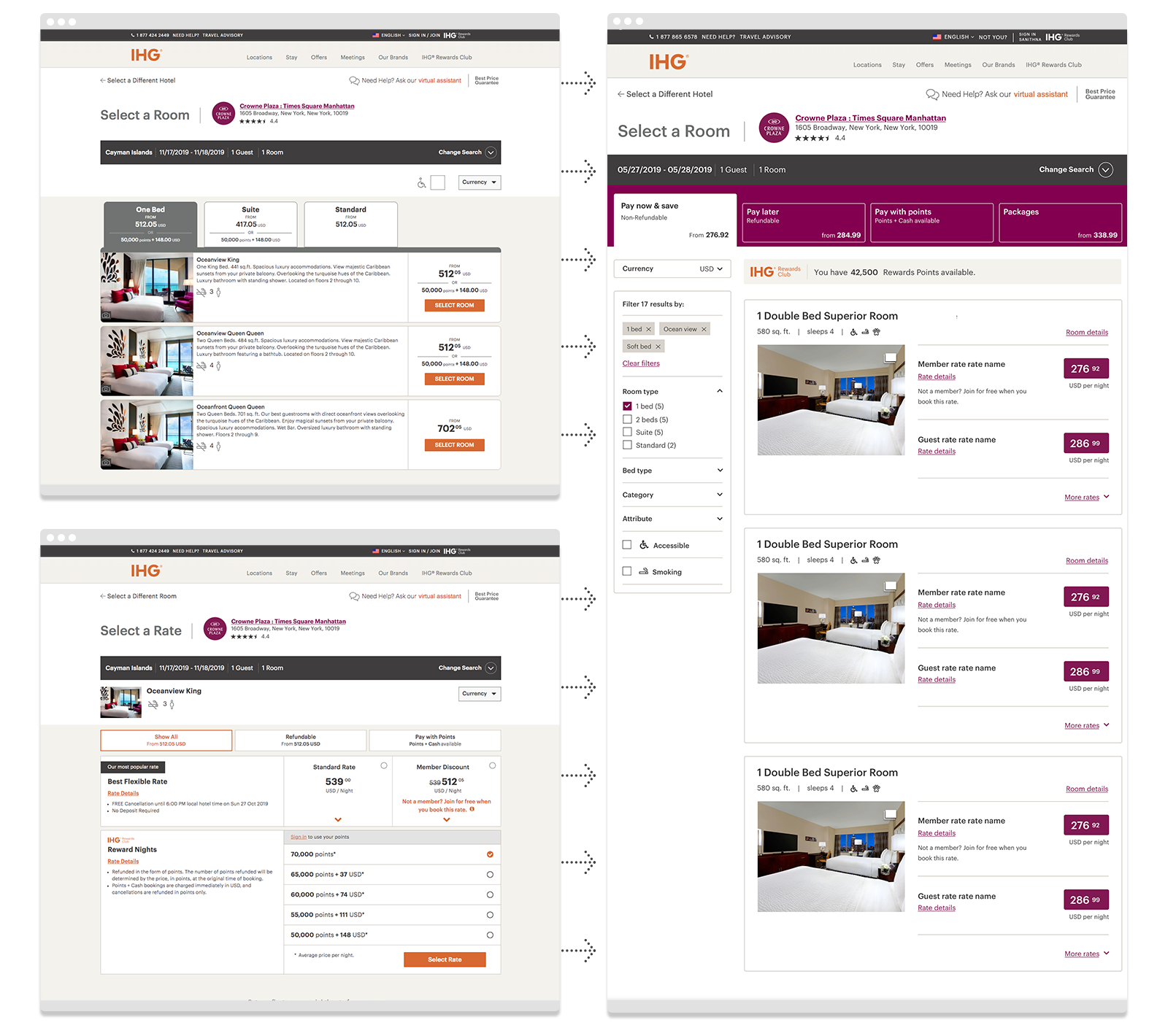Simplifying the process was to be done over phases, to mitigate issues in development. The first phase involved merging two of the steps in the flow, the “Select a Room” page and the “Select a Rate” page, where there were dependencies in the choices.