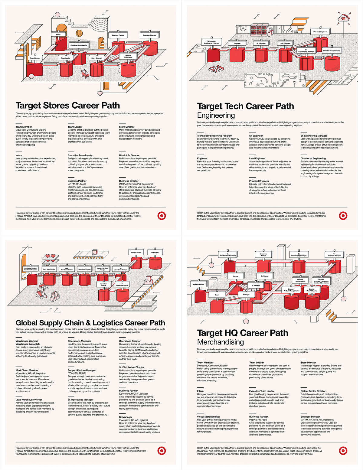 Retaining current employees is equally as important as recruiting new employees. To inform, develop, and engage Target team members, I created a range of digital and printed assets for the Talent Acquisition Team’s initiatives.